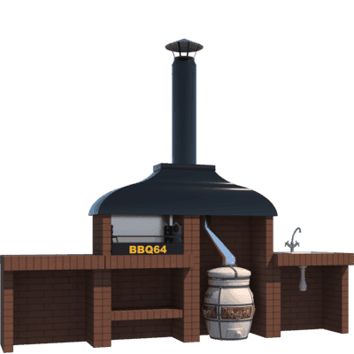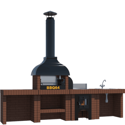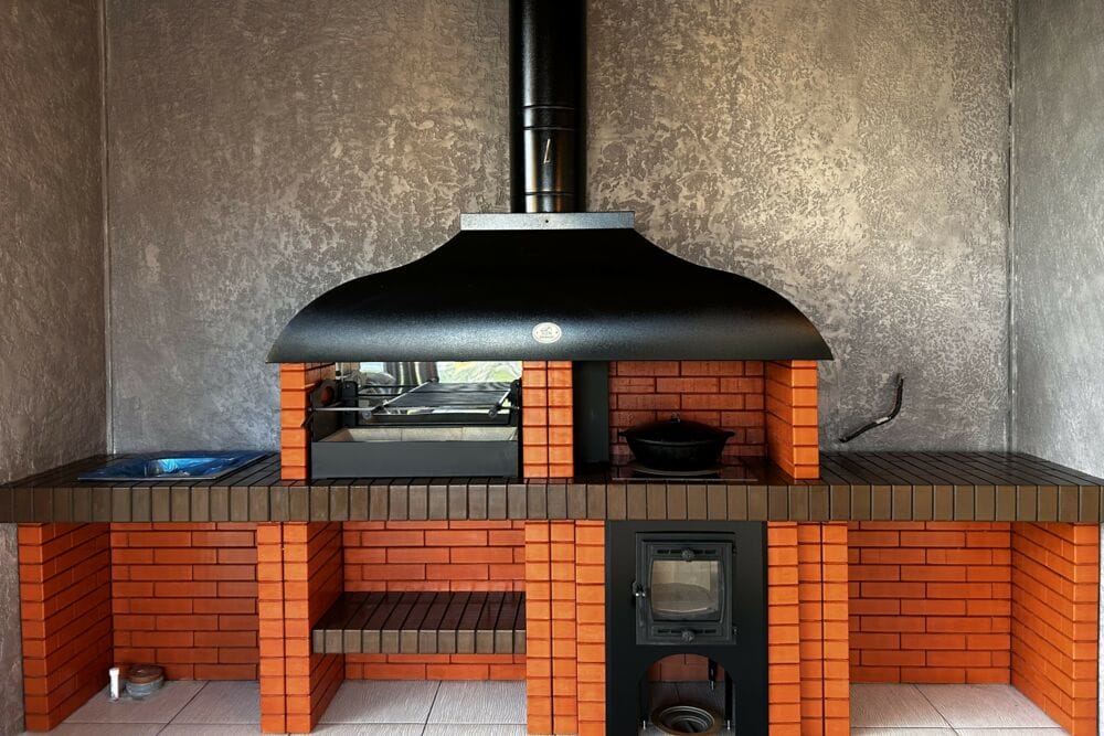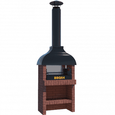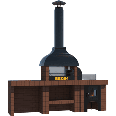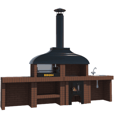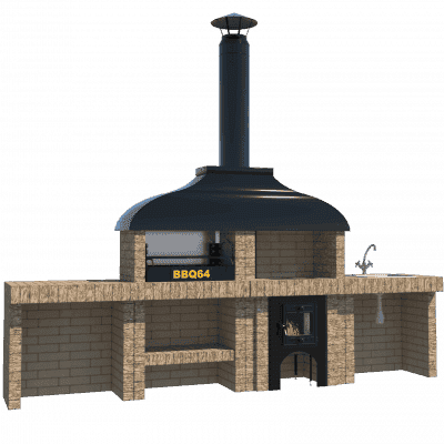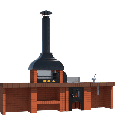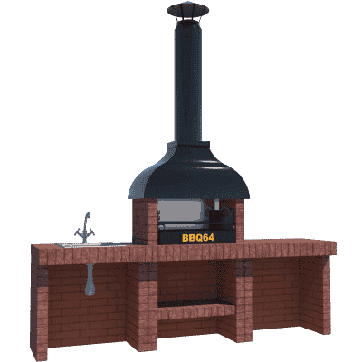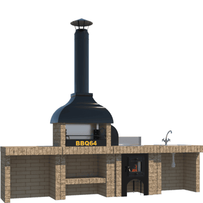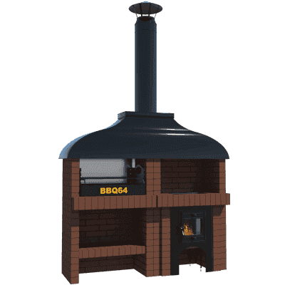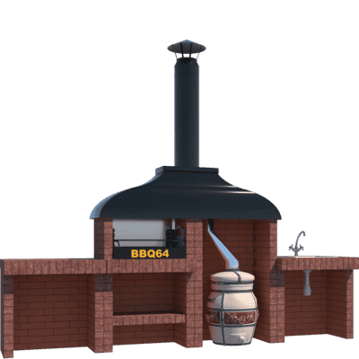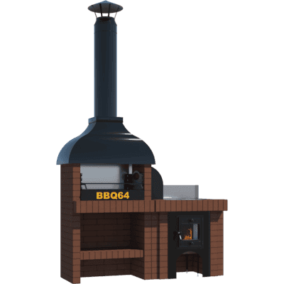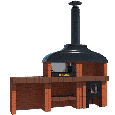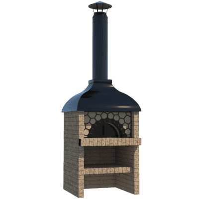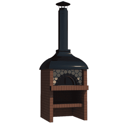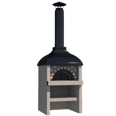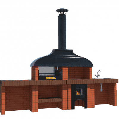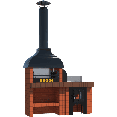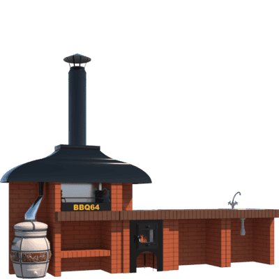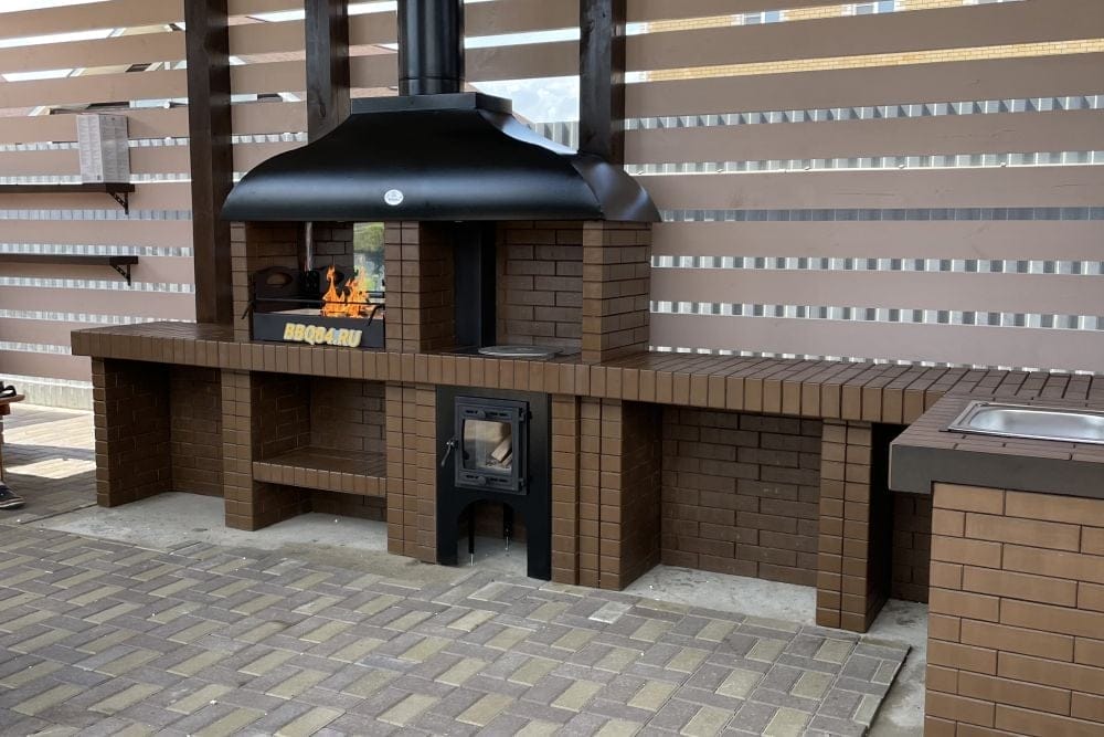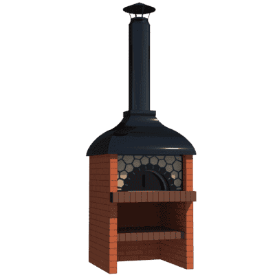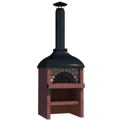 Мангал – это самый популярный элемент печного комплекса барбекю из кирпича, потому что предназначен для приготовления шашлыка и множества других вкусных блюд. Основание и стенки топки выполнены из красного керамического кирпича. Металлический дымосборник состоит из двух куполов: рабочего толщиной 1,5-2 мм и декоративного с покрытием эмалью. Дымоход выполнен из двустенного сэндвича с утеплением и закачивается оголовком-искрогасителем. Дополнительно возможно установить шибер для регулировки процесса горения. В топку встраивается мангальная вставка с металлом 3 мм, которая футерована шамотным кирпичом и имеет несколько уровней рамки для шампуров. Задняя стенка защищена нержавеющим фронтальным экраном-отражателем для избежания перегрева задней стенки топки. Таким образом, мангал можно топить не только углем, но и дровами.