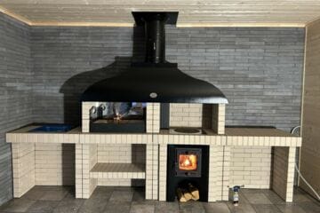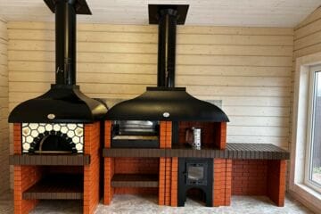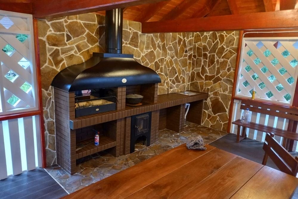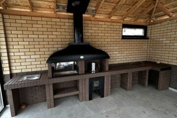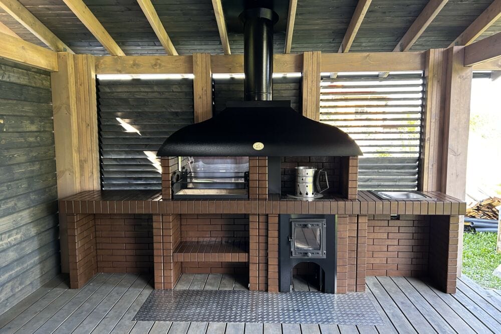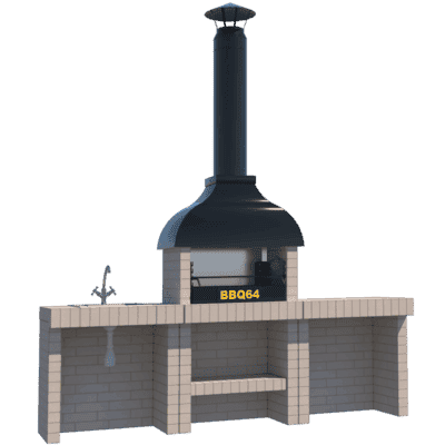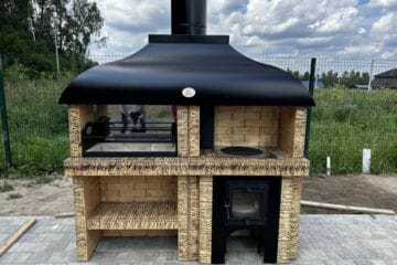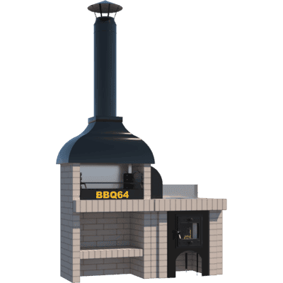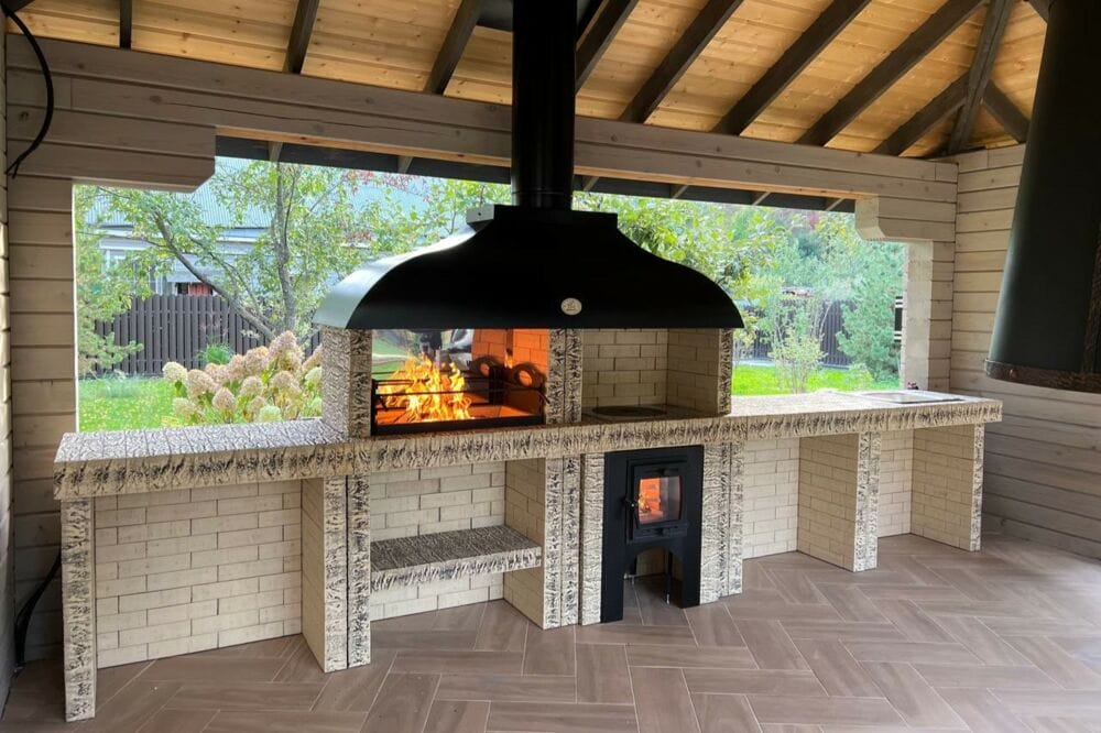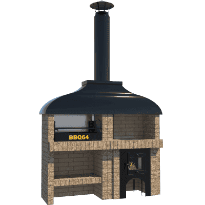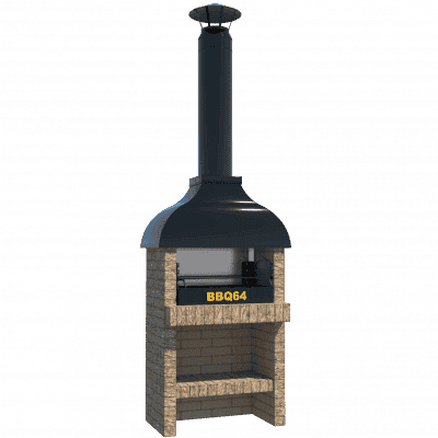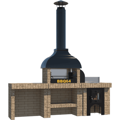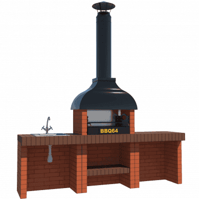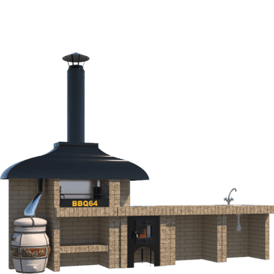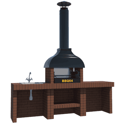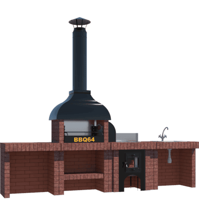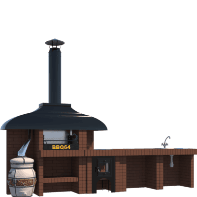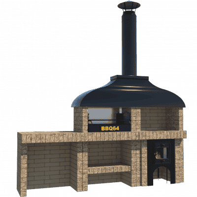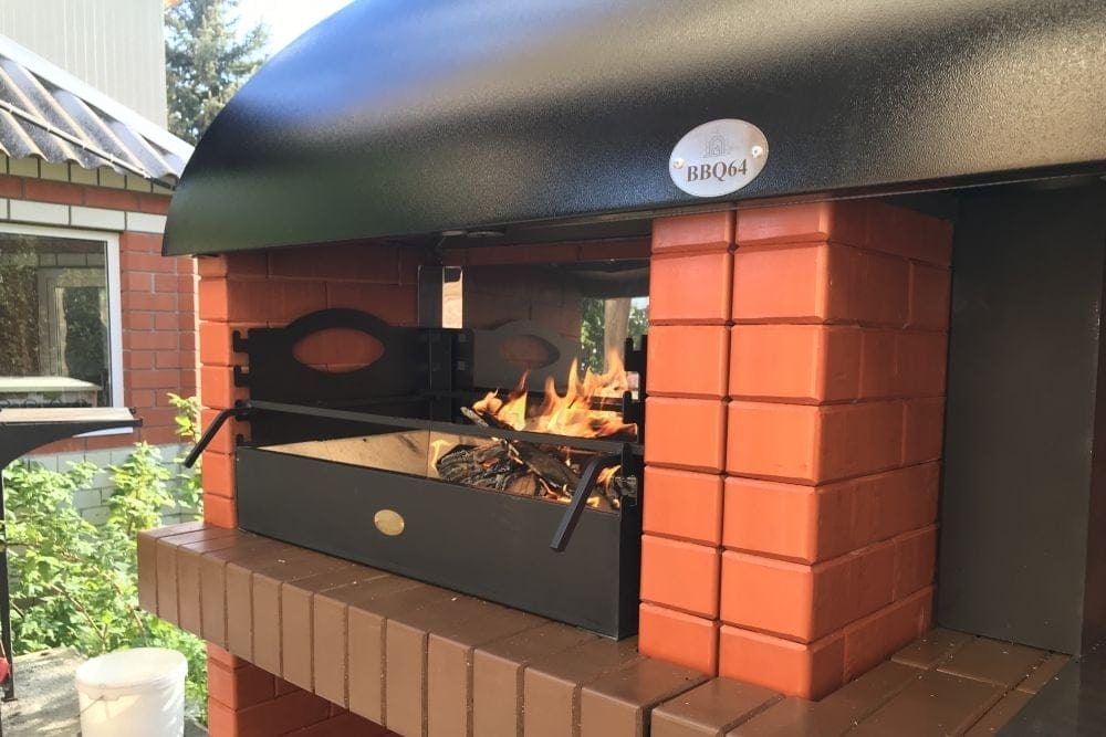 Мангал – это самый популярный элемент печного комплекса барбекю из кирпича, потому что предназначен для приготовления шашлыка и множества других вкусных блюд. Основание и стенки топки выполнены из красного керамического кирпича. Металлический дымосборник состоит из двух куполов: рабочего толщиной 1,5-2 мм и декоративного с покрытием эмалью. Дымоход выполнен из двустенного сэндвича с утеплением и закачивается оголовком-искрогасителем. Дополнительно возможно установить шибер для регулировки процесса горения. В топку встраивается мангальная вставка с металлом 3 мм, которая футерована шамотным кирпичом и имеет несколько уровней рамки для шампуров. Задняя стенка защищена нержавеющим фронтальным экраном-отражателем для избежания перегрева задней стенки топки. Таким образом, мангал можно топить не только углем, но и дровами.